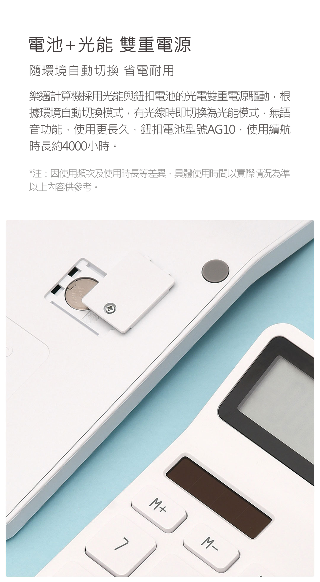 👉樂邁計算機採用光能與鈕扣電池的光電雙重電源驅動,根據環境自動切換模式