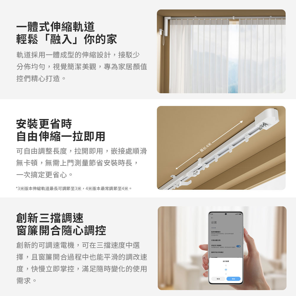 ✨創新三檔調速,窗簾開合隨心調控
